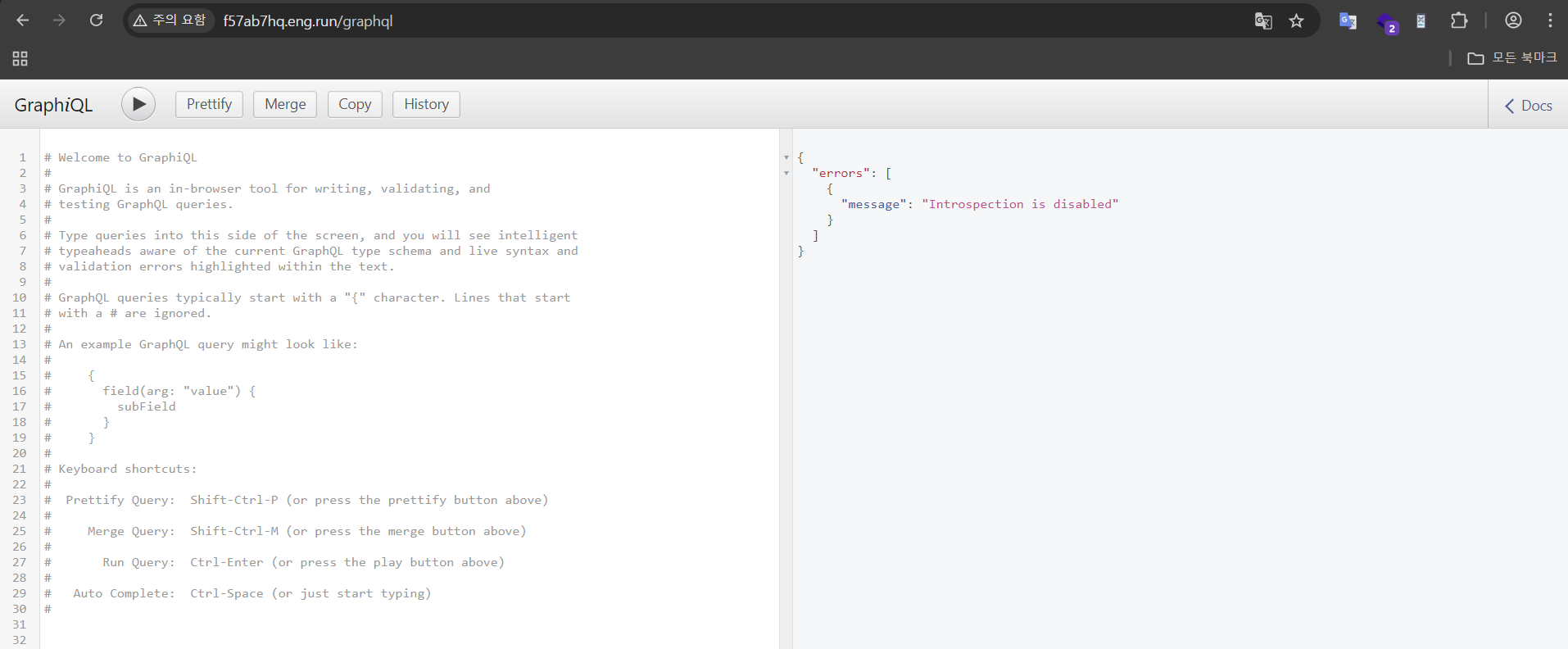 - introspection이 적절히 막혀 있다. 하지만 secretFlag 필드에 대한 조회를 방지하기 위해선 사용자로부터 입력값 제어를 제한하든지, secretFlag 필드에 대한 접근을 추가로 막아야할 것이다.