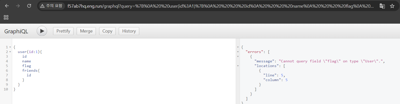 그냥 flag 필드가 있는지 확인해보면 flag 필드가 없기 때문에 에러가 반환되는 것을 알 수 있다.