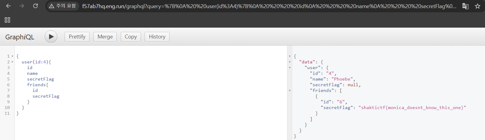 아까와 달리 secretFlag에 null이 적혀서 반환됐다. secretFlag라는 필드가 있다는 의미이다. 따라서 모든 user들을 순회하며 이 필드를 확인하면 될 것이다.