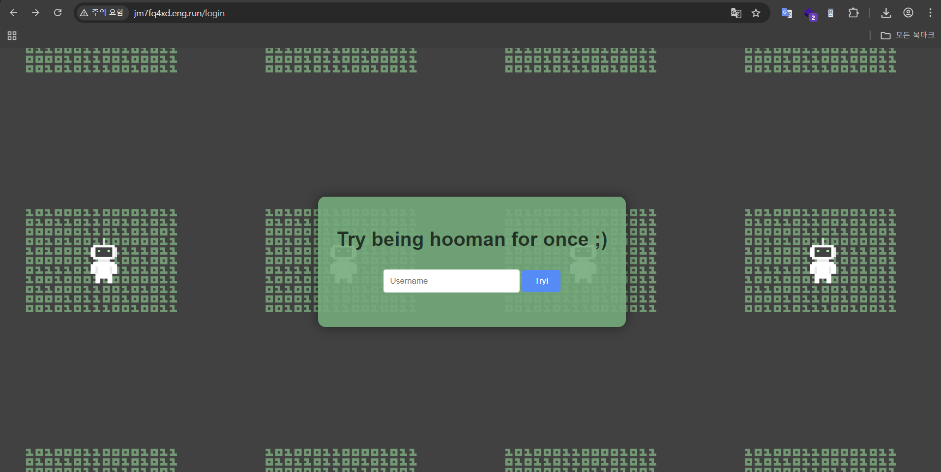 처음 문제 사이트에 들어가면 위와 같은 화면을 볼 수 있다. username을 입력하면 `Nah, you ain't hooman`이라는 문자열이 출력된다. 코드와 함께 찾아보자.