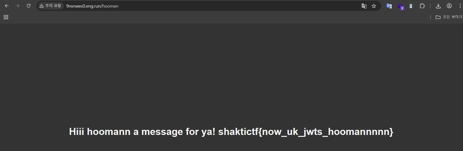 이렇게 생성된 토큰을 사용해 /hooman 페이지에 접근하면 flag를 얻을 수 있다.