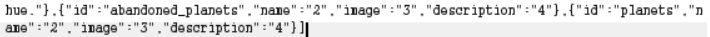 query=SELECT * FROM planets union select concat(description,' : ',id,' : ',image,' : ',name),2,3,4 from abandoned_planets