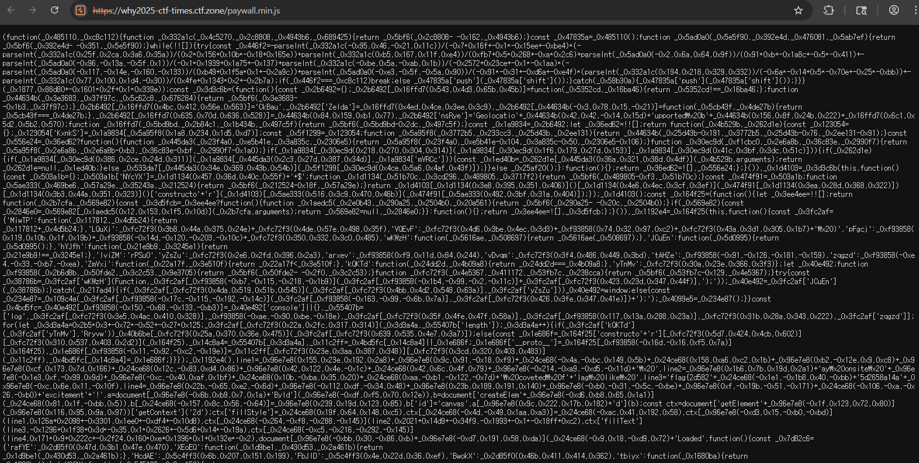 위 js 파일을 호출해오는 페이지인 `https://why2025-ctf-times.ctf.zone/`에서 콘솔창에 line3를 입력하면 flag를 구할 수 있다.