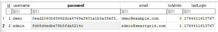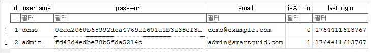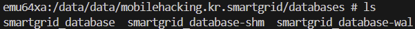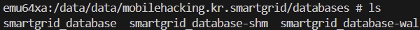 `/data/data/mobilehacking.kr.smartgrid/databases`에서 데이터베이스 파일을 확인할 수 있으며, 그 결과는 아래와 같다.