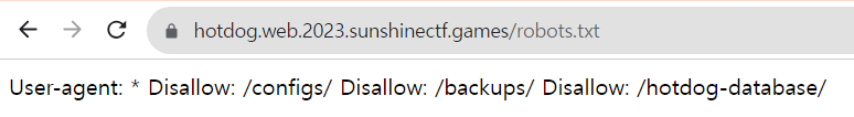 /hotdog-database 를 robots.txt에서 hotdog-database에 대한 크롤링을 제한하고 있다. 하지만 robots.txt로 접근을 통제하는 것은 아니기 때문에 직접적으로 접속은 가능하다.