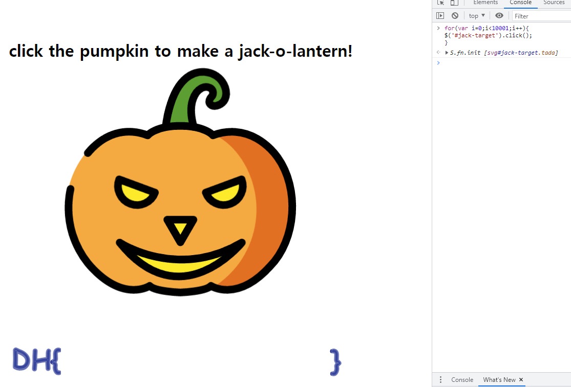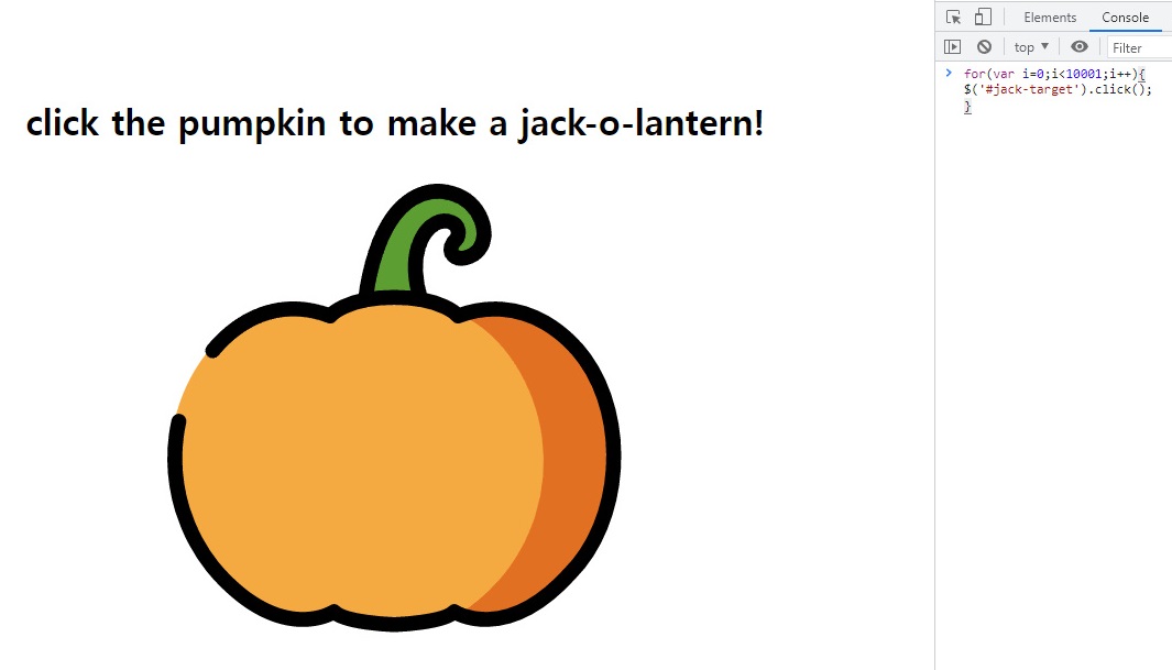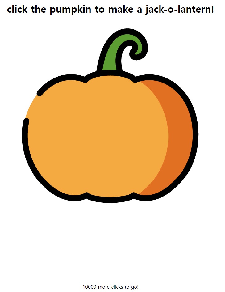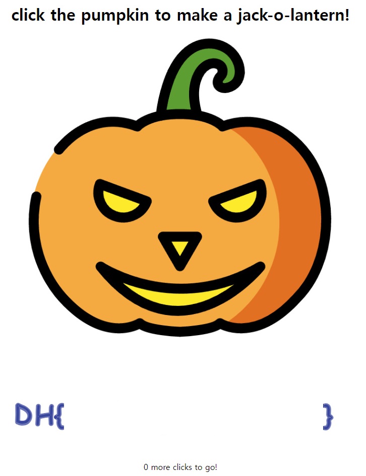 Description 할로윈 파티를 기념하기 위해 호박을 준비했습니다! 호박을 10000번 클릭하고 플래그를 획득하세요!