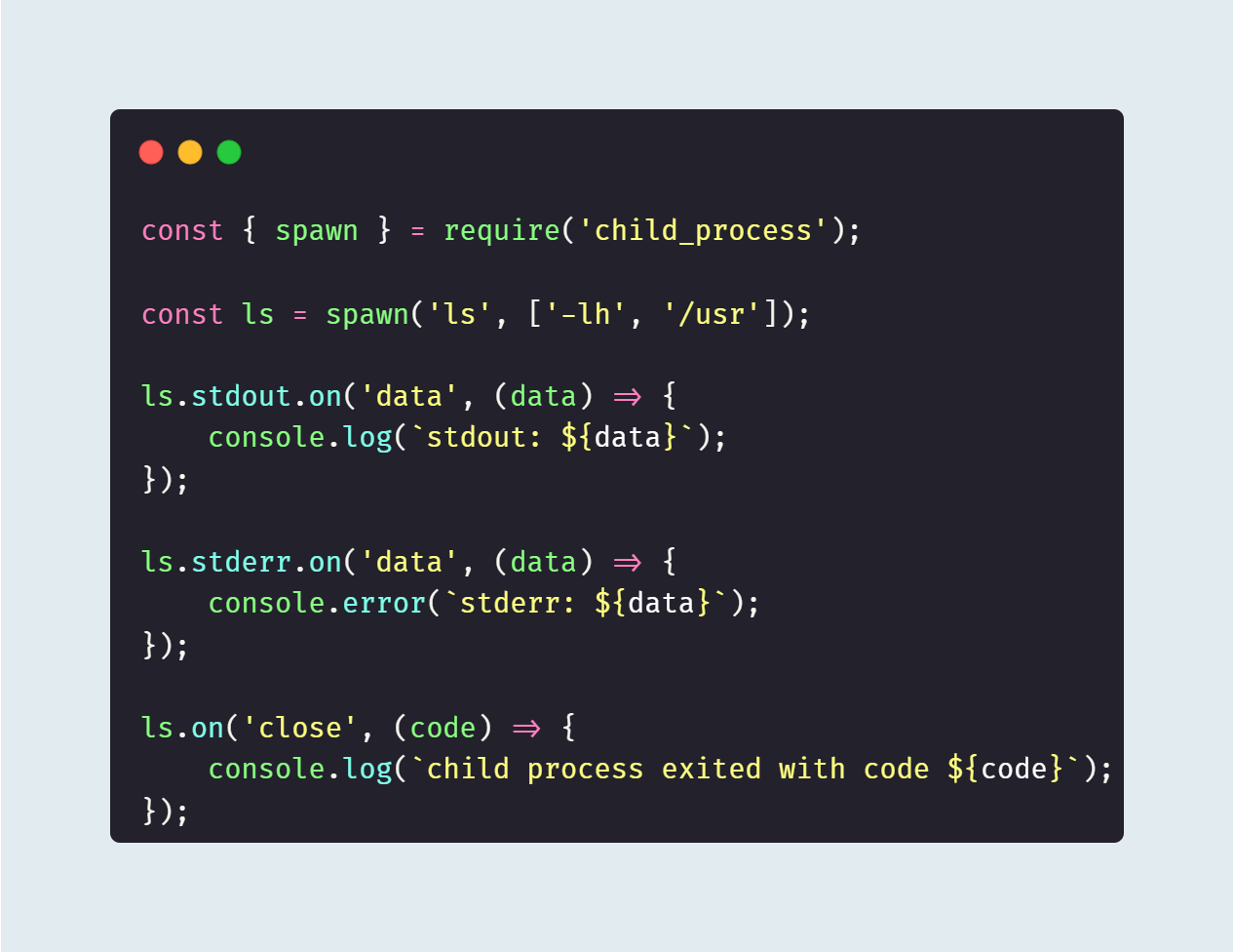 - spawn(command, [args], [options]): 새로운 프로세스를 시작하기 위해 사용되며, 스트리밍 데이터(예: 큰 파일 처리)에 가장 적합하다. spawn은 exec와 달리 즉시 ChildProcess 객체를 반환하며, 이를 통해 프로세스의 stdout, stderr 스트림에 접근할 수 있다.
