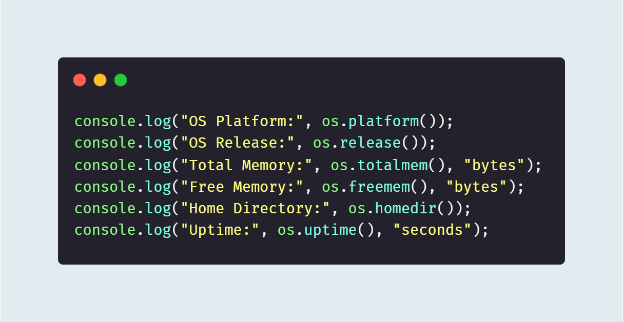 Node.js의 `os` 모듈은 운영 체제와 관련된 유틸리티 메서드와 속성을 제공하는 내장 모듈이다. 이 모듈을 사용하면 시스템의 아키텍처, 사용 가능한 메모리, 운영 체제의 이름등과 같은 운영 체제에 대한 정보를 가져올 수 있으며, 시스템의 환경 변수에 접근하거나, 시스템의 평균 로드, CPU 정보, 네트워크 인터페이스 등을 확인할 수 있다.