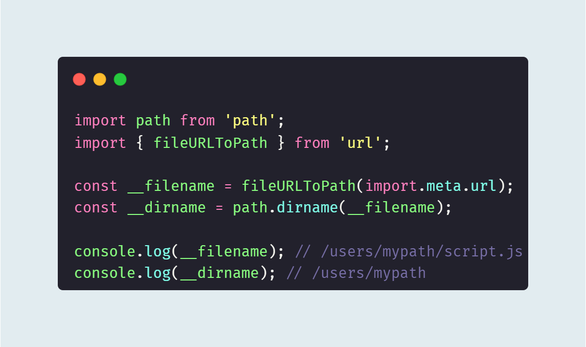 ES 모듈에서는 __filename과 __dirname라는 전역 변수가 없다. 그러나 현재 파일의 경로 정보를 얻으려면 다음과 같은 방법을 사용할 수 있다.