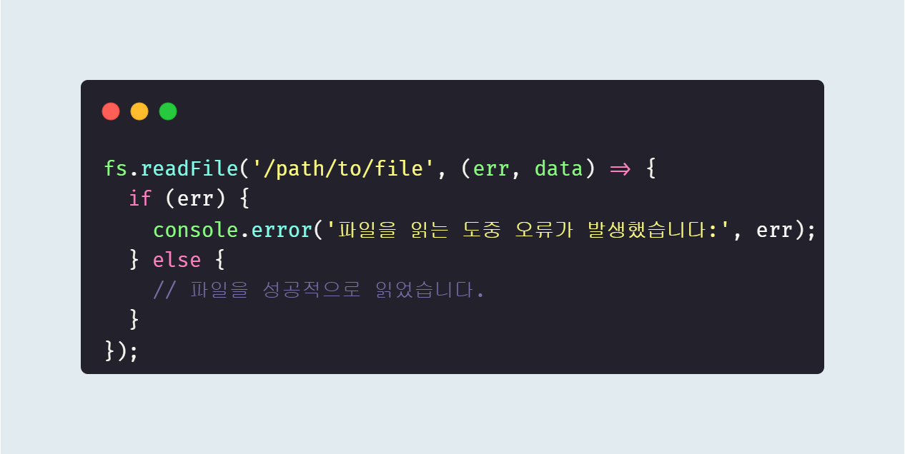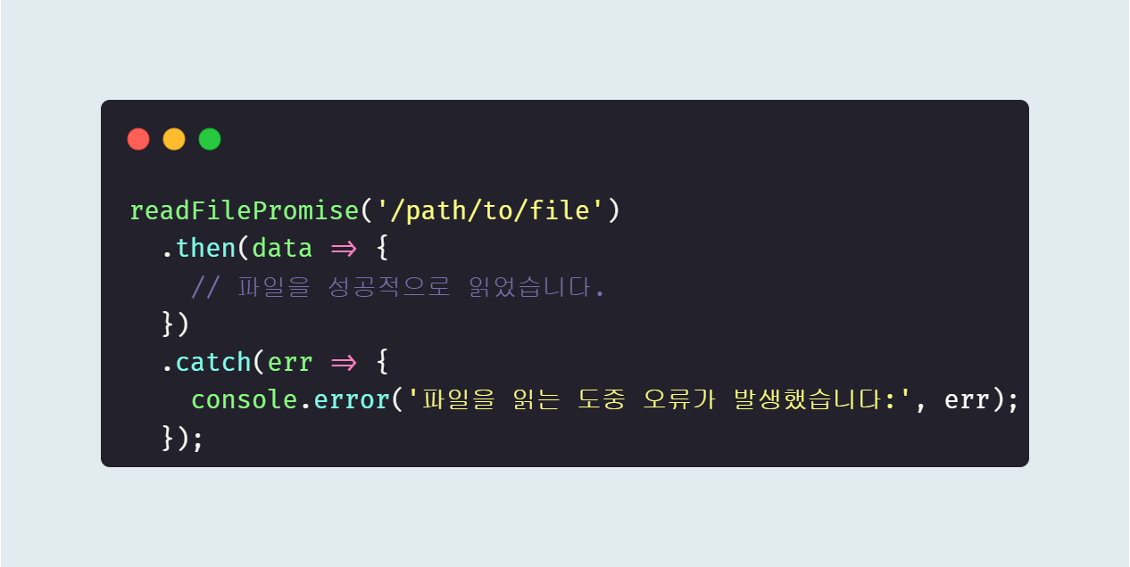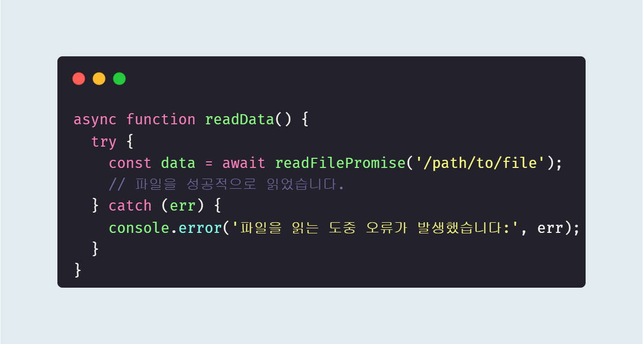 비동기 코드에서 발생하는 예외는 `try...catch`로 잡을 수 없다. 대신, 콜백 함수 내부에서 에러를 처리하거나, 프로미스를 사용하는 경우 `.catch()` 메서드를 활용해야 한다.