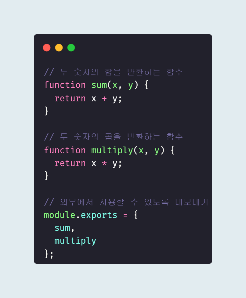 - 모듈 내보내기: 모듈에서 외부로 내보내고자 하는 객체, 함수, 변수등을 `module.exports` 객체에 할당한다. 이 객체가 모듈을 불러올 때 반환되는 값이다.