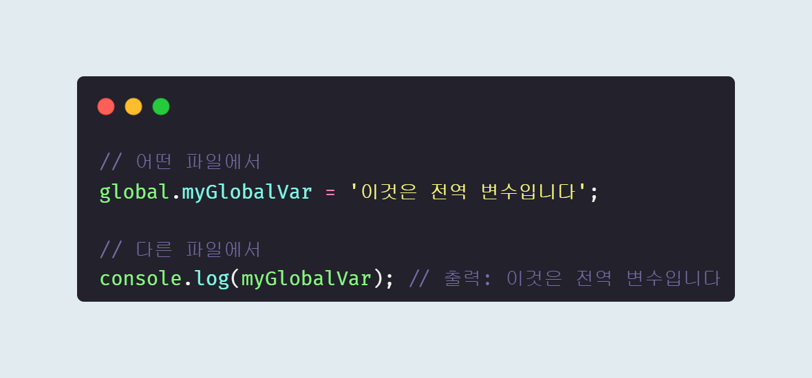 브라우저의 window와 같은 전역 객체이다. 전역 객체이므로 모든 파일에서 접근할 수 있으며, window.open 메서드를 그냥 open으로 호출할 수 있는 것처럼 global도 생략할 수 있다. require 함수도 global.require에서 global이 생략된 것이다.