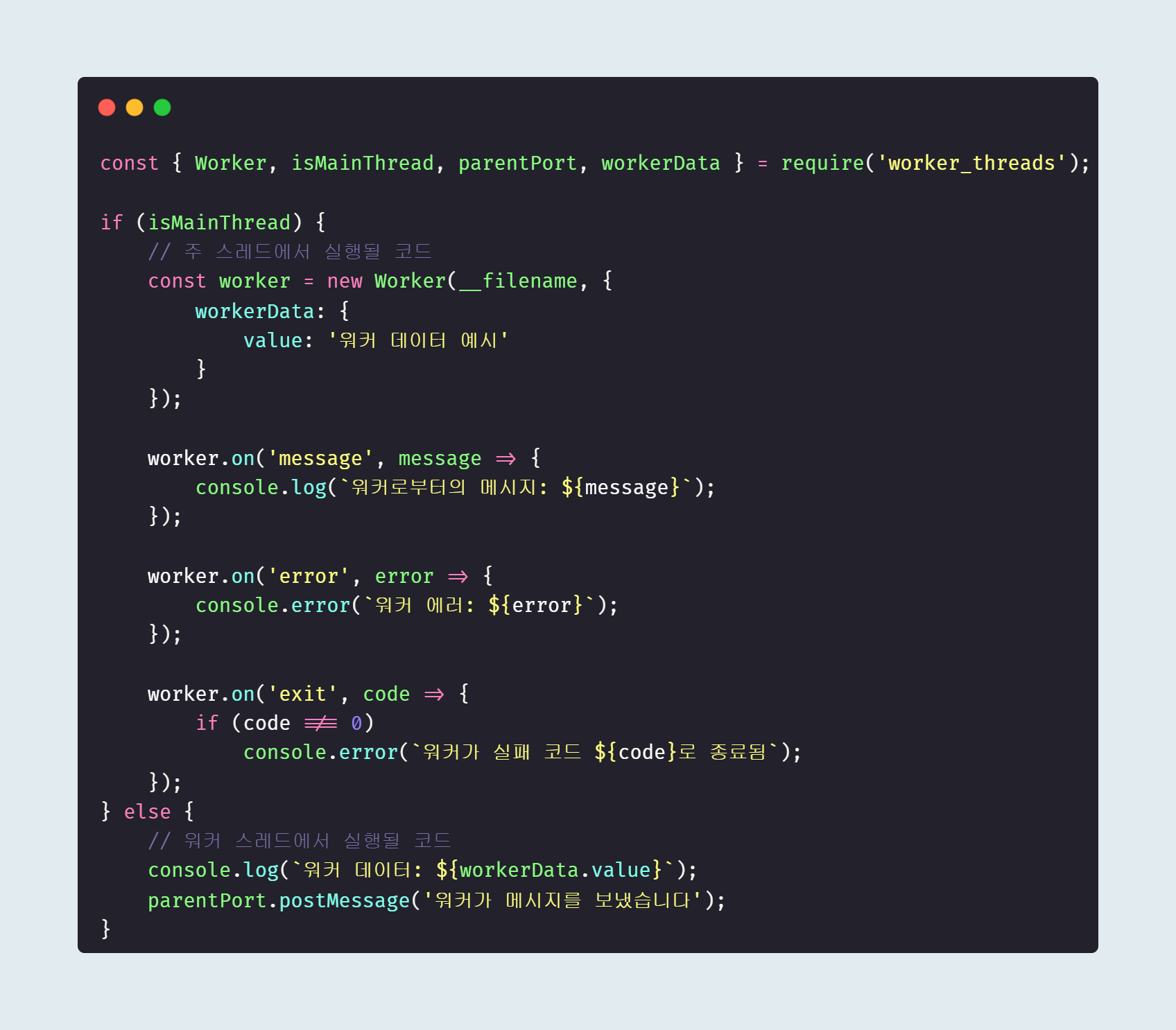 worker_threads 모듈은 Node.js에서 멀티스레딩을 구현할 때 필수적인 도구로, 애플리케이션의 성능을 크게 향상시킬 수 있다.