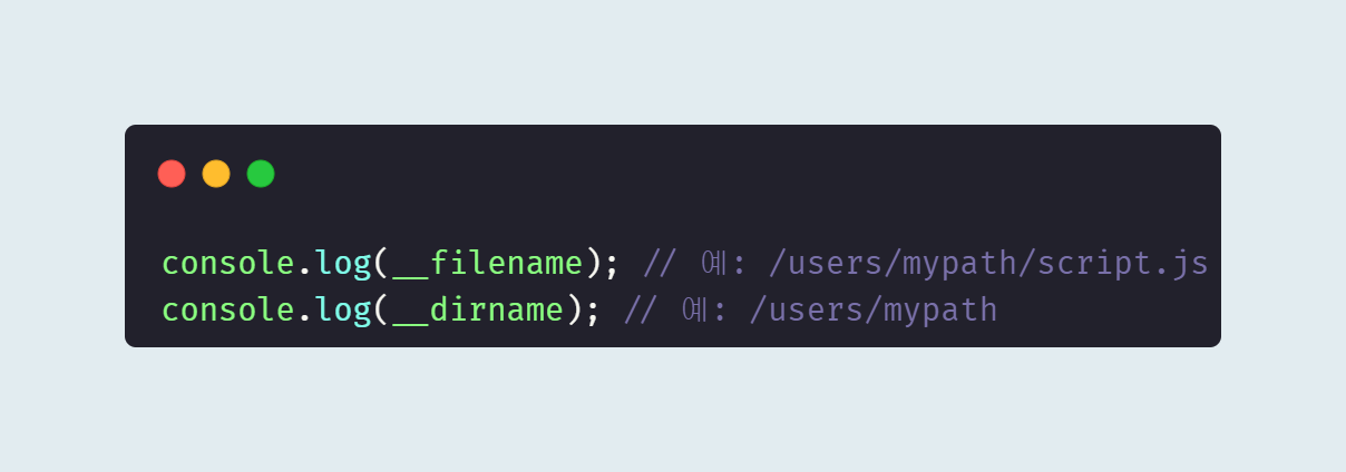 - __filename: 현재 실행 중인 스크립트의 파일명을 담고 있는 문자열이다. 이 값은 실행 중인 파일의 절대 경로를 포함한다.