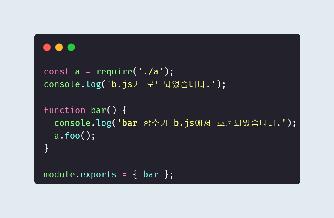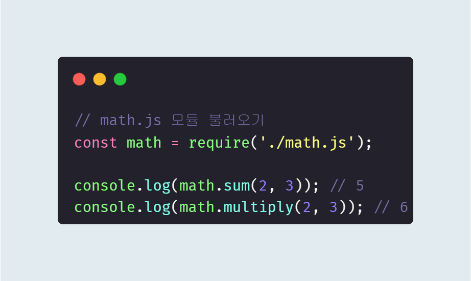 - 모듈 불러오기: 다른 모듈에서 필요한 모듈을 사용하려면 `require()` 함수를 사용하여 해당 모듈을 불러온다. `require()` 함수는 모듈의 경로를 인자로 받고, 해당 모듈의 `module.exports` 객체를 반환한다.