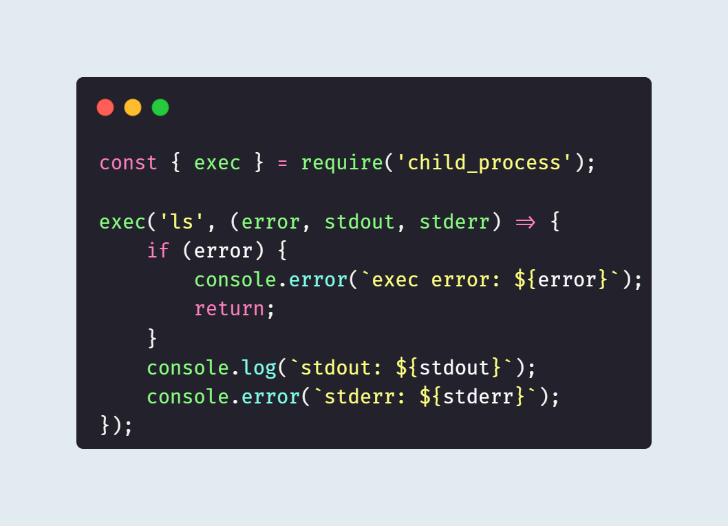- exec(command, [options], callback): 셸을 사용하여 명령어를 실행하고, 완료될 때 콜백을 호출한다. 콜백 함수는 `error`, `stdout`, `stderr` 인자를 받는다. 이 함수는 주로 간단한 셸 명령을 실행할 때 사용된다.