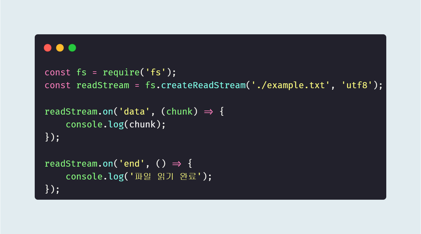 이 예제에서는 파일을 읽기 위해 읽기 가능한 스트림을 생성하고, 파일의 내용이 조각으로 읽힐 때마다 해당 족가을 콘솔에 출력한다. 파일 읽기가 완료되면 'end' 이벤트가 발생한다.