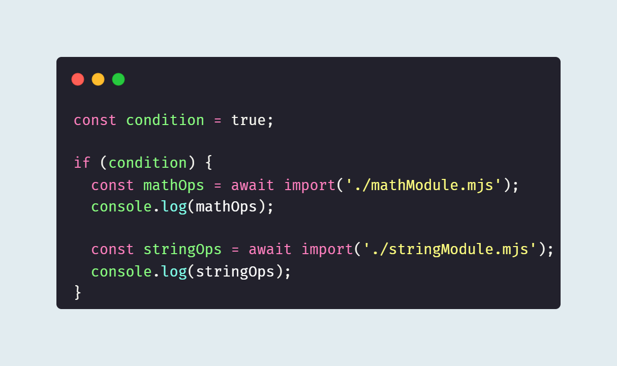 import는 Promise를 반환하기 때문에 await 혹은 then을 사용해야한다. 위 예시에서는 async를 사용하지 않았는데, ES 모듈의 최상위 스코프에서는 async 함수 없이도 await를 사용할 수 있다. 다만 CommonJS 모듈에서는 안된다.