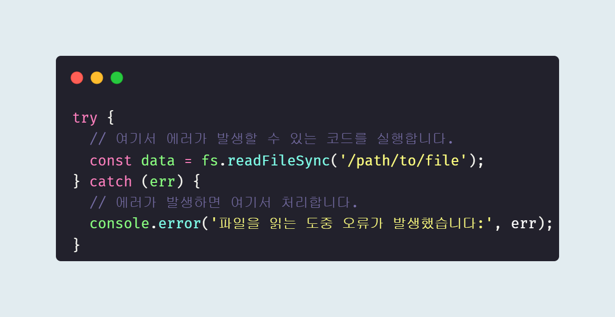 동기 코드에서 예외를 처리하는 가장 일반적인 방법은 `try...catch` 문을 사용하는 것이다.