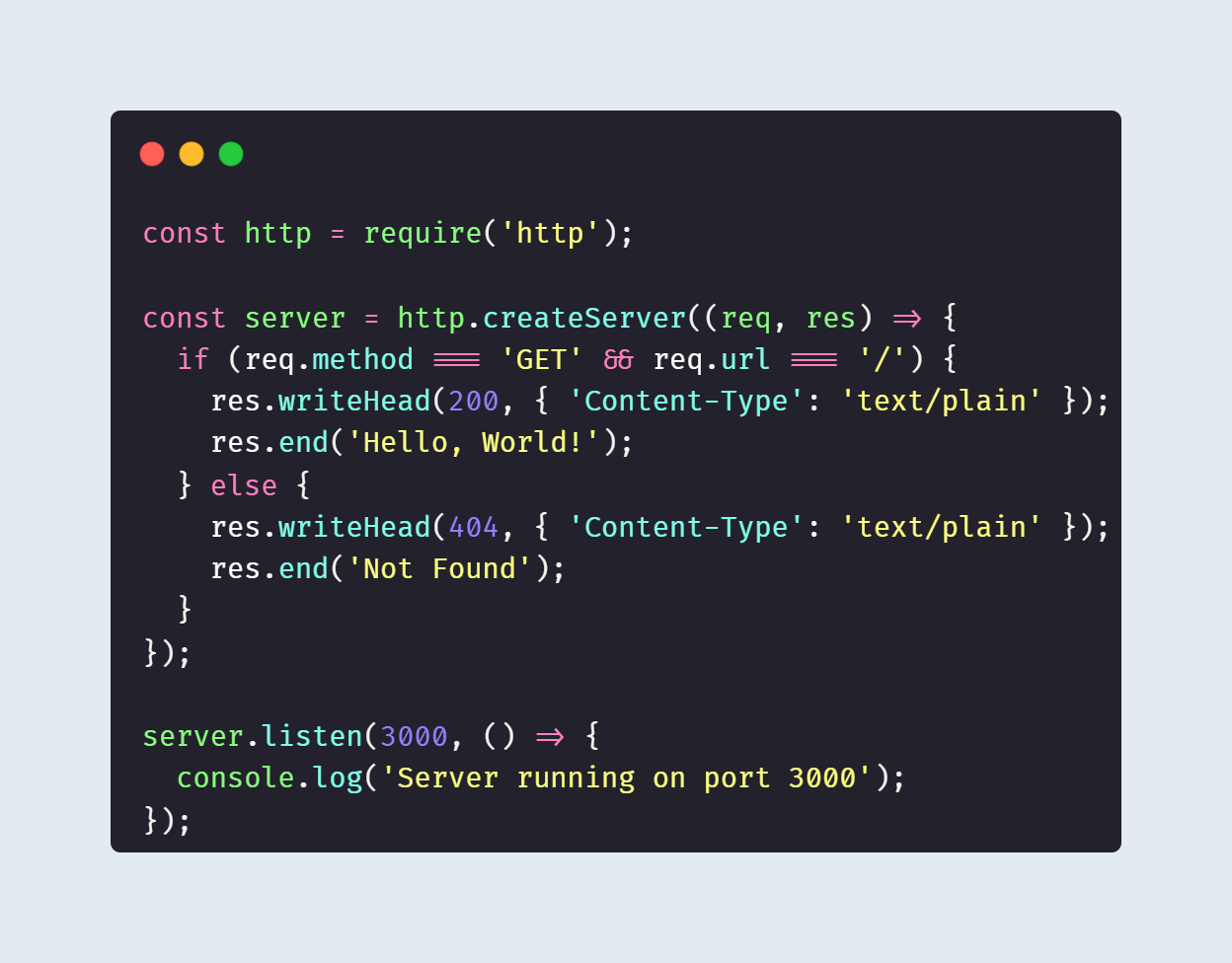 - res.writeHead(statusCode[, statusMessage][, headers]): 응답의 상태 코드와 헤더를 한 번에 설정한다.