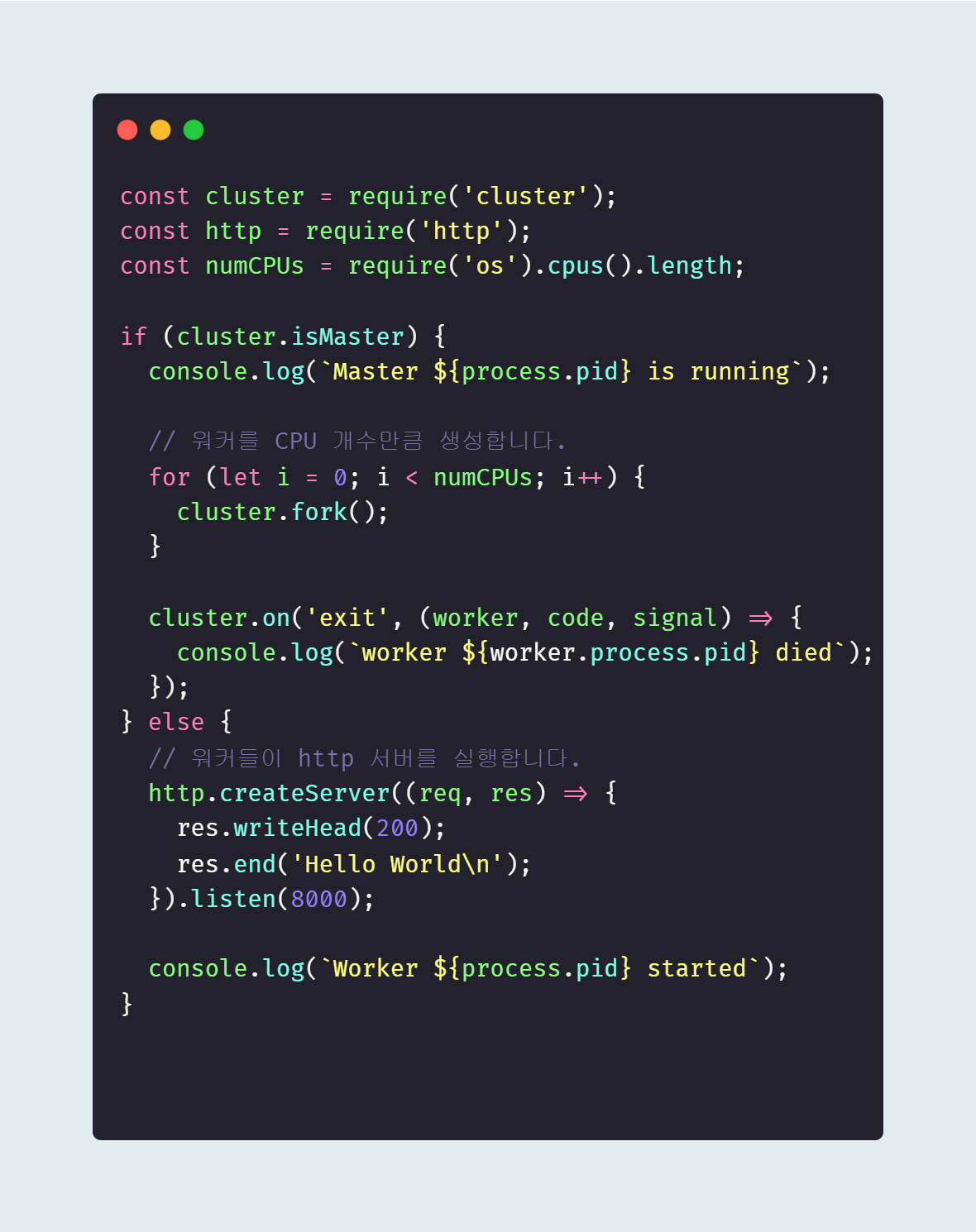 - 멀티프로세스 실행: cluster 모듈을 사용하면, 메인 프로세스가 여러 개의 워커 프로세스를 생성하고 관리할 수 있다. 각 워커는 동일한 서버 코드를 별도의 프로세스로 실행하며, 이를 통해 여러 CPU 코어를 효율적으로 사용할 수 있다.