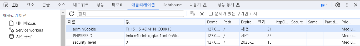 쿠키 설정 방법은 `개발자 도구 - 애플리케이션 - 우클릭 - 새로 추가`를 통해 만들 수 있다.