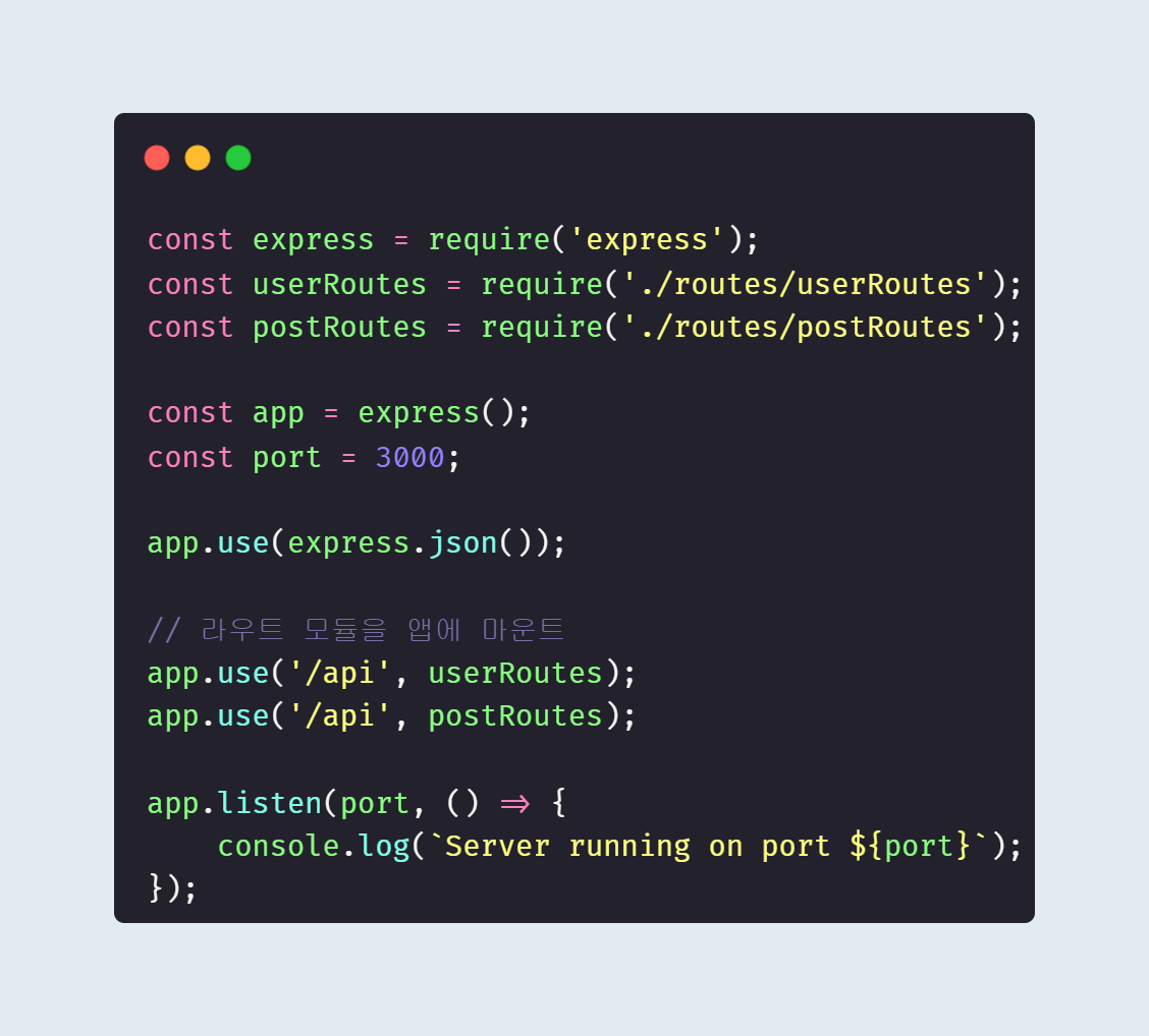 위 코드에서 `/api` 경로를 기반으로 `userRoutes`와 `postRoutes` 라우터를 마운트했다. 이렇게 하면 사용자 목록을 조회하는 URL은 ` http://localhost:3000/api/users`가 된다.