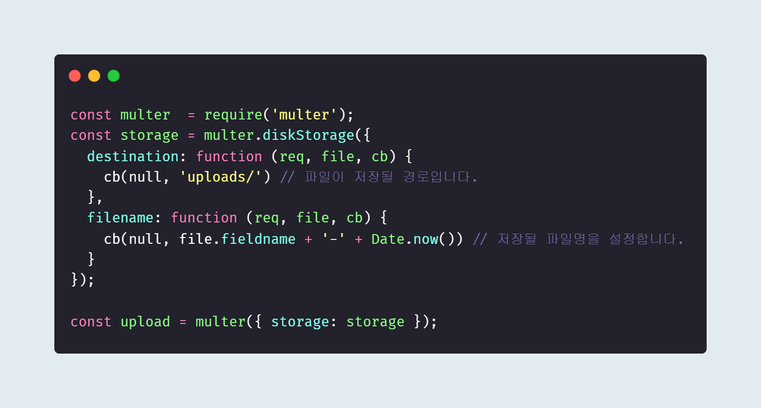 - 파일 저장: `multer`는 파일을 디스크에 저장하거나 메모리에 임시로 보관하는 기능을 제공한다.