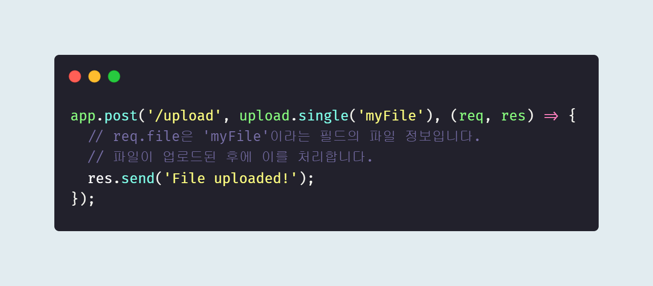 - 접근성: 파일은 `req.file` 또는 `req.files`를 통해 요청 처리기에서 접근할 수 있다.
