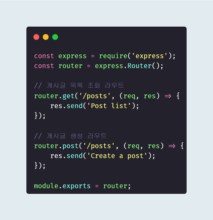 이처럼 `Router` 객체를 사용하면 Express 앱의 라우트를 효율적으로 관리하고, 각 라우트를 별도의 파일로 분리하여 프로젝트의 구조를 개선할 수 있다.