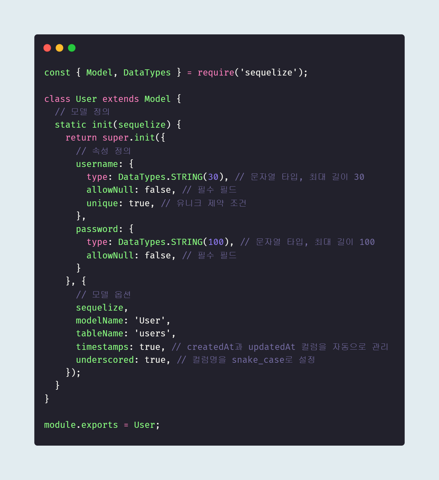 - 모델 파일 생성: 모델마다 별도의 파일을 생성한다. 예를 들어 `user.js` 파일에서 USER 모델을 정의한다