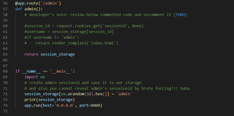 우리가 지금까지 살펴본 페이지는 home 페이지와 login 페이지 뿐이다. 그런데 @app.route(/admin) 이라는 페이지를 코드에서 확인할 수 있다.