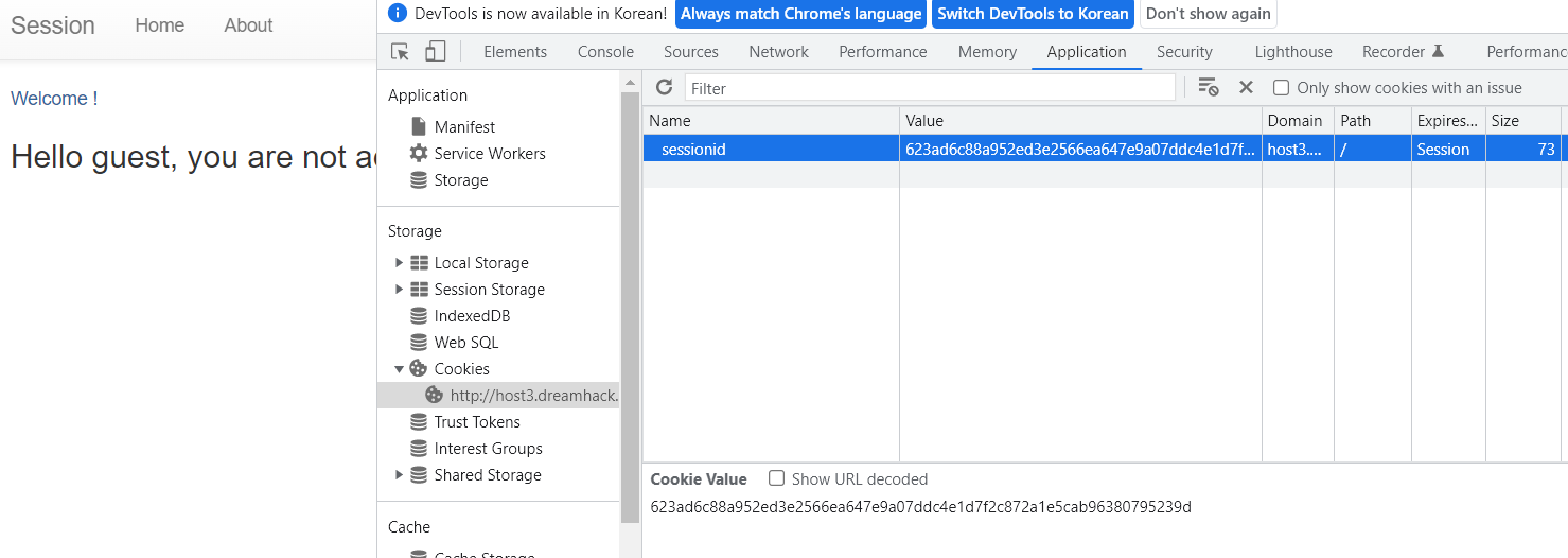 F12 - Application로 들어가면 쿠키를 변경할 수 있다.
