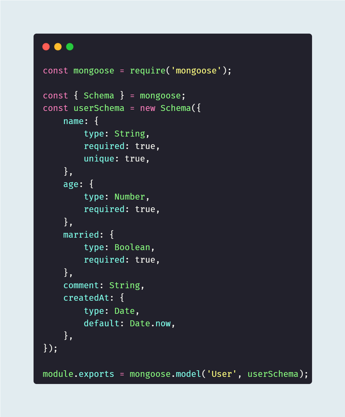 Schema 생성자를 사용해 스키마를 만들 수 있다. `_id`를 기본 키로 알아서 생성하므로 따로 적어줄 필요는 없다.