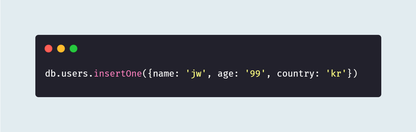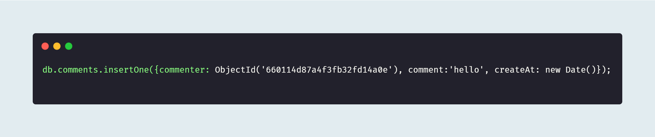 `db.[컬렉션명].insertOne(다큐먼트)`를 통해 다큐먼트를 생성할 수 있다. 생성 시 `ObjectId`가 출력되는데, 이 오브젝트 아이디가 검색할 때 쓰이는 키이다. 이 키와 함께 create를 할 수도 있다.
