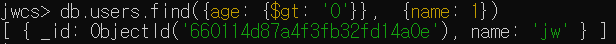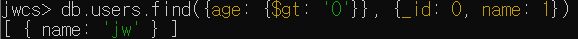 `age: {$gt: '0'}`은 조건을 나타낸다. age가 '0'보다 큰 경우 해당 요소를 출력한다.