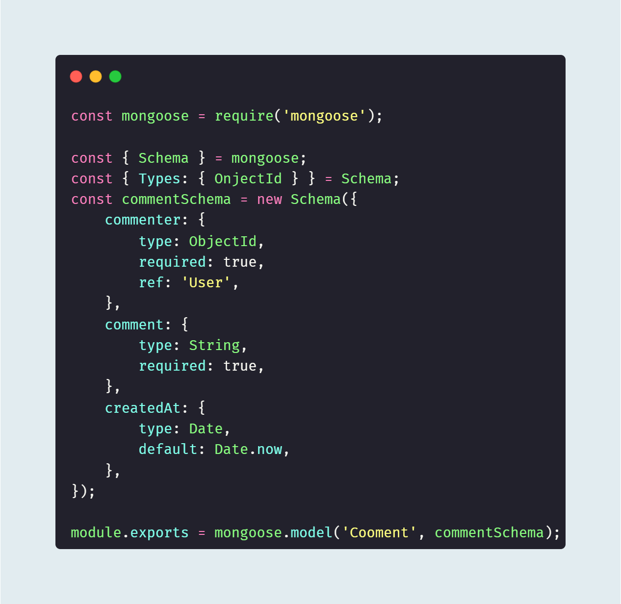 `const { Types: { ObjectId } } = Schema;`: `Schema` 객체 내의 `Types` 객체에서 `ObjectId`를 구조 분해 할당을 통해 가져온다. `ObjectId`는 MongoDB에서 독특한 식별자로 사용되는 특수한 데이터 타입이다. Mongoose에서는 이를 통해 문서 간의 관계를 정의할 때 사용된다.