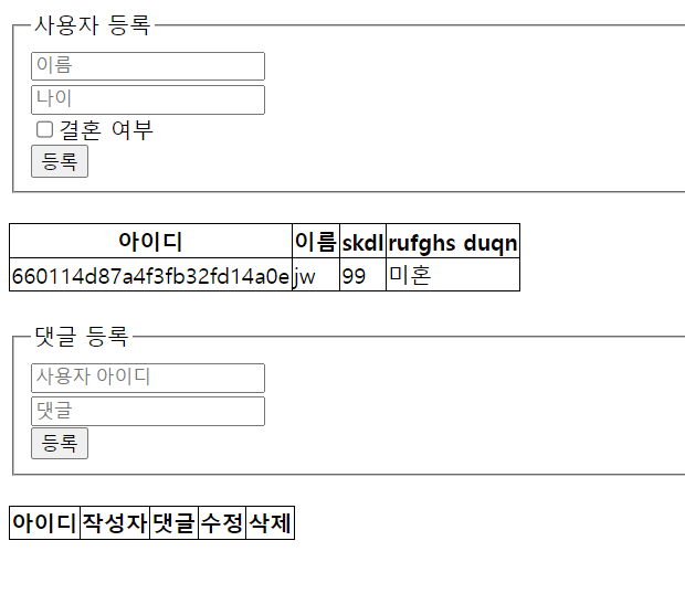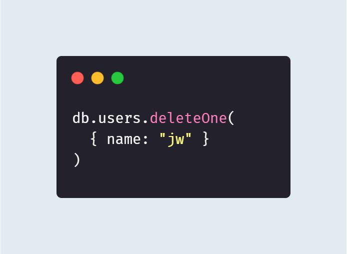 `name: "jw"`인 다큐먼트 하나를 삭제한다. 앞선 예시들과 마찬가지로 `deleteMany`를 통해 다수의 다큐먼트를 삭제할 수도 있다.