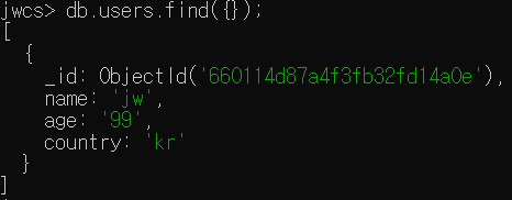 `db.[컬렉션명].find({})`를 통해 컬렉션 내의 모든 다큐먼트를 조회할 수 있다.