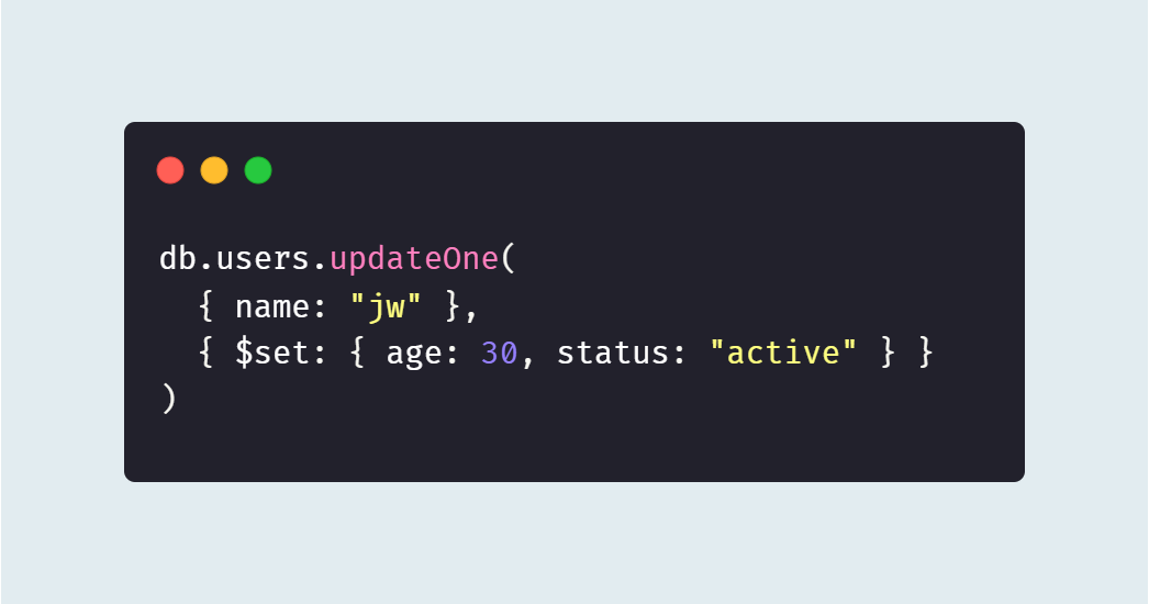 `$set: {age: 30, status: "active"}`를 통해 age를 30으로, status를 active로 업데이트한다.