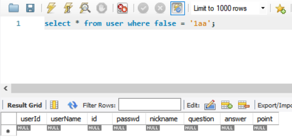 5. select * from user where false = 'aa';