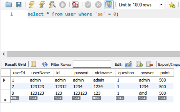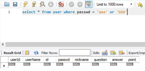 - 11번재 상황이다. passwd='aaa' or '2bbb'이다.