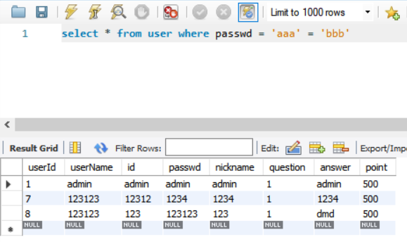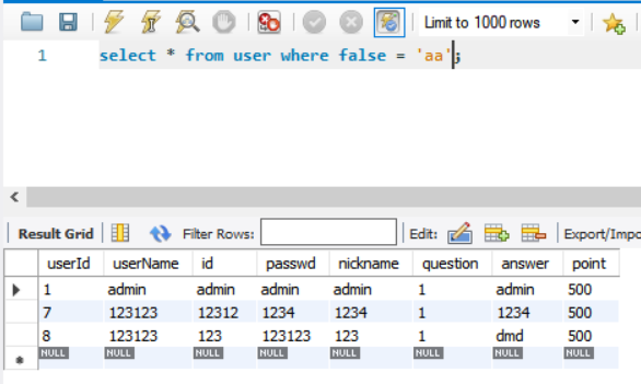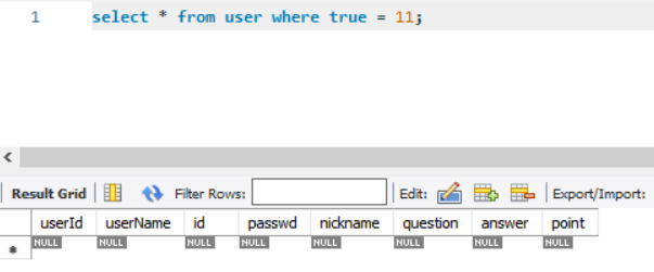 2. select * from user where true = 11;