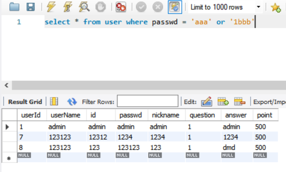 11. select * from user where passwd = 'aaa' or '2bbb'
