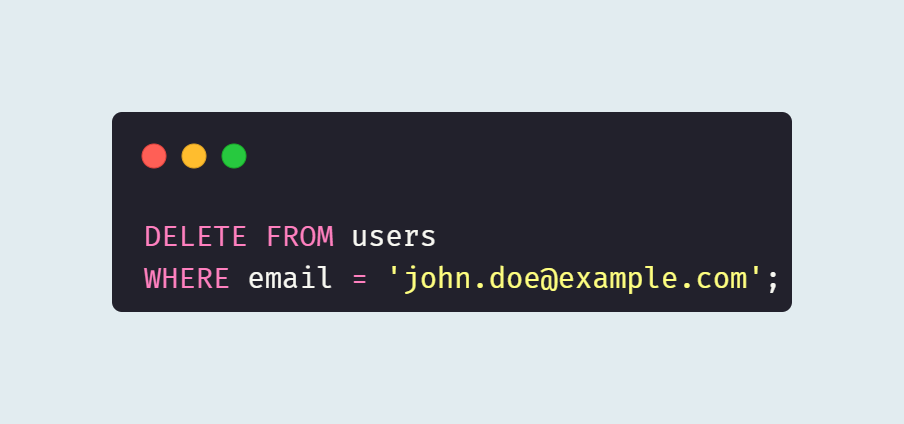 where 뒤에는 조건을 의미한다. `email = 'john.doe@example.com'`에 해당하는 칼럼을 삭제한다.