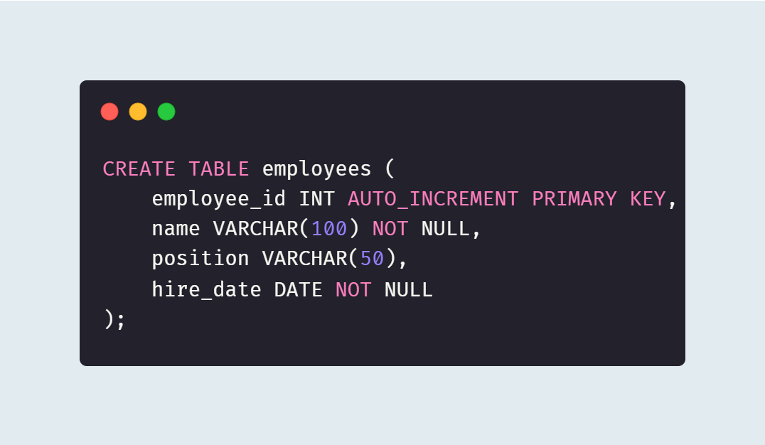 INT, VARCHAR(100), VARCHAR(50), DATE은 칼럼의 데이터 형식을 나타낸다.
